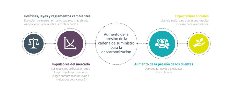 La Iniciativa Objetivos Basados en la Ciencia (Science-Based Targets Initiative, SBTi) establece que, si las emisiones de alcance 3 de una empresa superan el 40 % del total de sus emisiones, estas representan un riesgo significativo en los negocios. Estas presiones se acumulan y animan a las organizaciones a cuantificar sus inventarios de emisiones de alcance 3 y establecer objetivos de reducción.